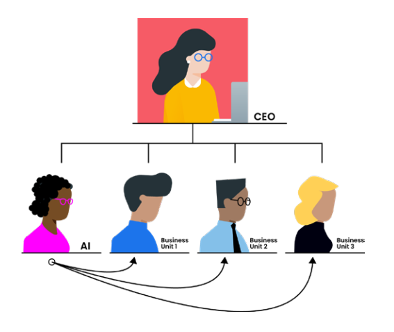 Nhiều công ty hiện đang tổ chức với nhiều đơn vị kinh doanh cùng báo cáo cho CEO. Với một đơn vị AI mới, bạn có thể gán ma trận nhân sự AI vào các bộ phận khác nhau để thúc đẩy các dự án liên phòng ban.